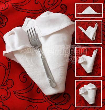 Сверните салфетку по диагонали, отогните нижний край на 2-3 см, сформируйте 3 складки и вставьте между зубцами вилки.