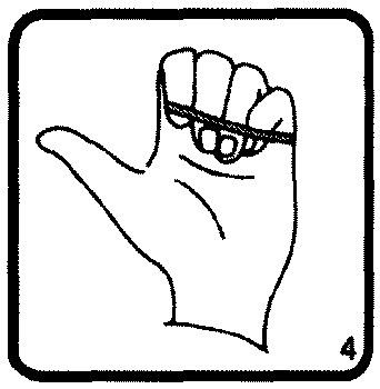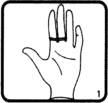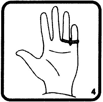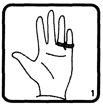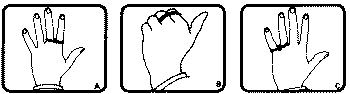 (А) Фокусник надевает резинку-колечко на указательный и средний палец. (В) Он складывает пальцы в кулак. (С) Когда он раскрывает кулак, резинка магически перепрыгивает на безымянный палец и мизинец. (На рисунках А, В и С дан вид со стороны зрителя.) На всех иллюстрациях пальцы фокусника направлены вверх.