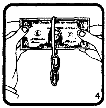 Вы показываете зрителям две канцелярские скрепки и долларовую купюру. Затем складываете купюру втрое и скрепками закрепляете складки на месте. Далее вы начинаете медленно растягивать сложенную купюру, и скрепки передвигаются все ближе и ближе друг к другу. Резким рывком вы завершаете растягивание, скрепки слетают с купюры и падают на стол, соединенные в цепочку из двух звеньев!