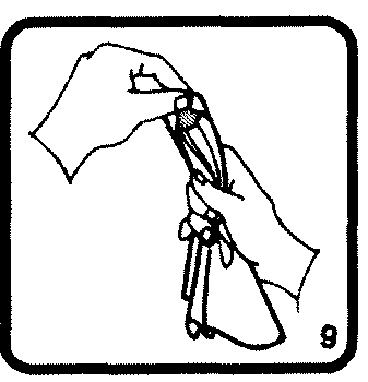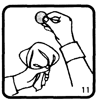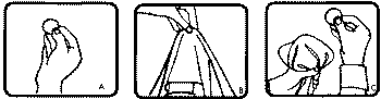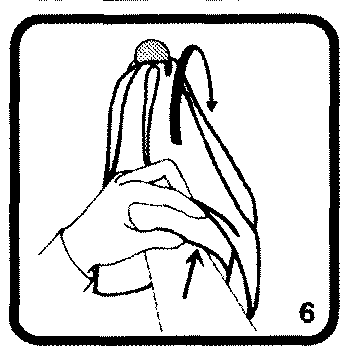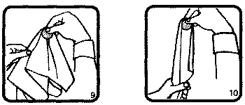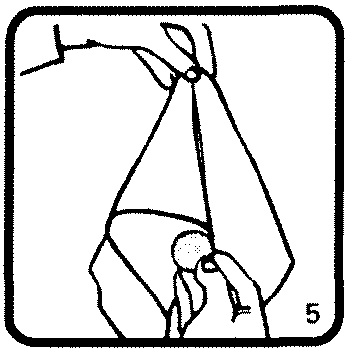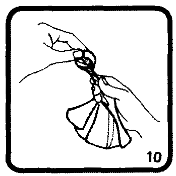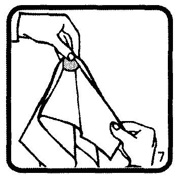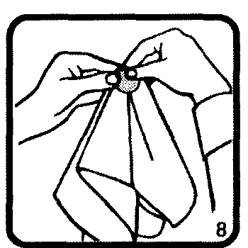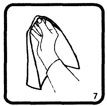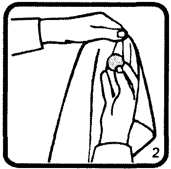 9. Левой рукой возьмитесь за монету через два слоя ткани платка и выньте из-под платка правую руку, как показано на рисунке. Аудитория остается в уверенности, что монета завернута в платок, а вы удерживаете монету через платок.
