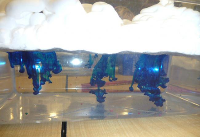 Опыт: Налейте в емкость воду и выдавите на нее пышные облака из пены. Затем капните пипеткой или чайной ложкой на пену в разных местах несколько капель красителя и ждите — из тучи скоро пойдет дождик.