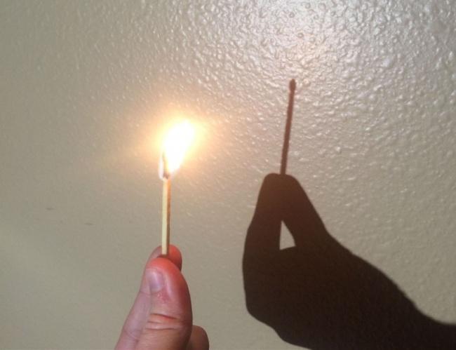 Опыт: Зажгите спичку и держите на расстоянии 10-15 сантиметров от стены. Посветите на спичку фонариком, и увидите, что на стене отражается только ваша рука и сама спичка. Казалось бы, очевидно, но я никогда об этом не задумывался.