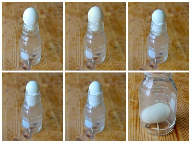 Опыт: Можно ли засунуть яйцо в бутылку, не разбив ни бутылки, ни яйца? Можно, если оно перепелиное. Но мы попробуем проделать это с обычным. Для этого яйцо сварите яйцо и очистите его от скорлупы. Смажьте горлышко бутылки растительным маслом. Подожгите бумагу и бросьте ее на дно бутылки, а потом сразу поставьте яйцо на горлышко. Когда бумага погаснет, яйцо всосется внутрь.