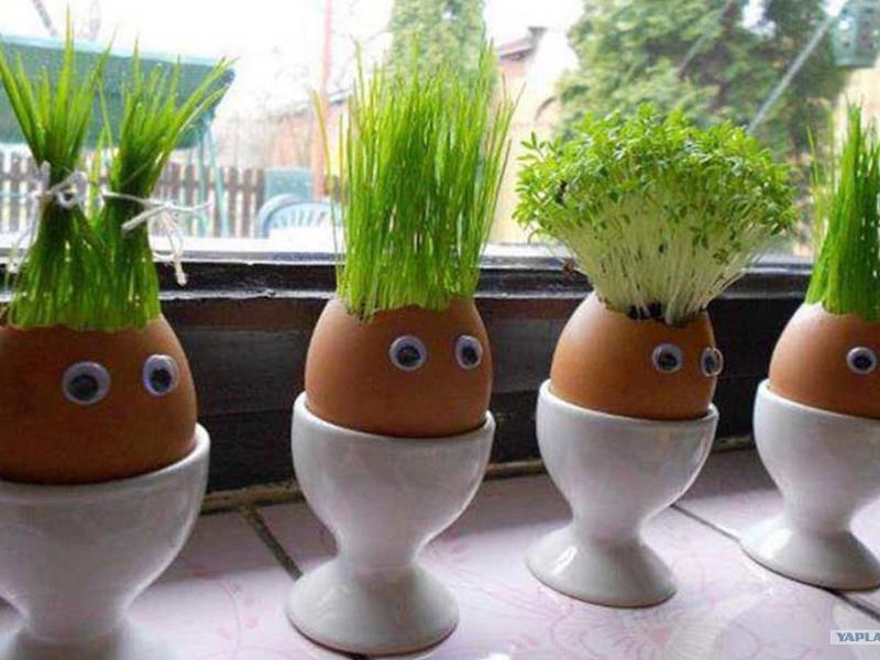 Яичные скорлупки наполните ватой, смочите ее водой и засыпьте семена. Это может быть укроп, фасоль, трава, петрушка и все, что угодно. Не забывайте поливать вату, чтобы она все время оставалась мокрой.
