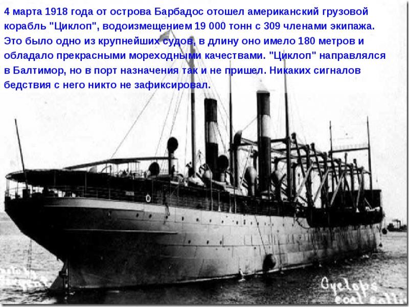 «Корабль не выдержал давления обрушившейся на него воды. Мы считаем, что «Циклоп» ушёл под воду буквально за пару минут. Скорее всего, большинство других пропавших в Бермудском треугольнике кораблей постигла та же участь», — предположил автор исследования Саймон Босалл.