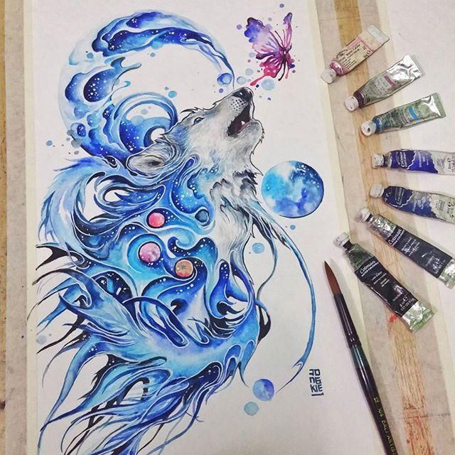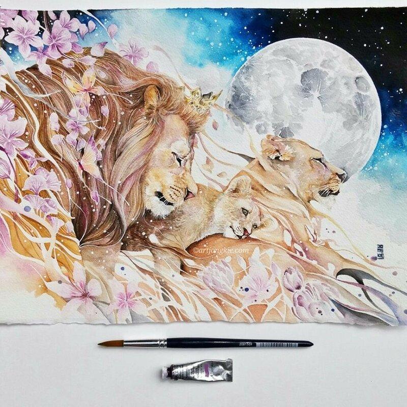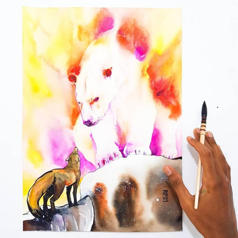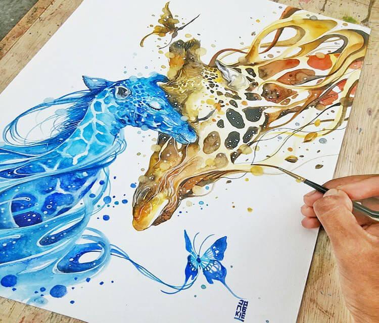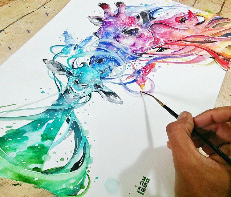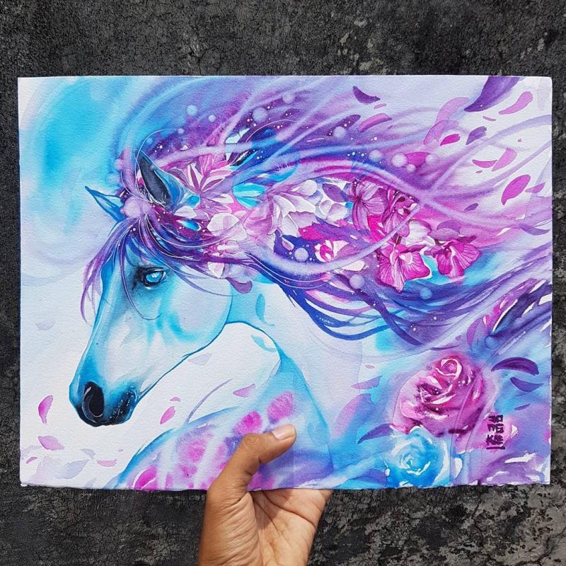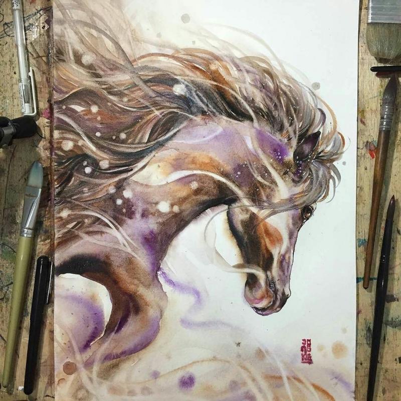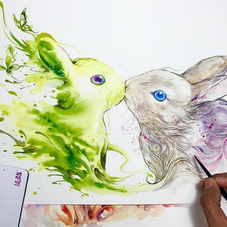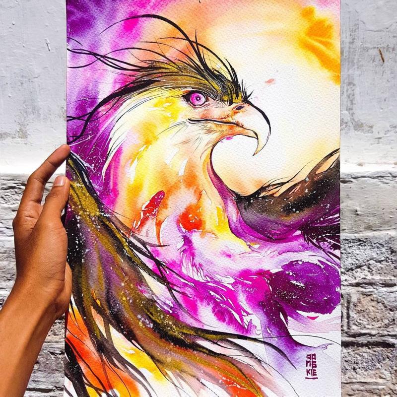 Акварель имеет выразительный и непредсказуемый характер. Например, если я хочу сделать яркую и причудливую картину, я просто позволю воде течь свободно по бумаге и играть с вкраплениями. Результат иногда не соответствует плану, но это именно то, за что я люблю эту краску — её характер. Когда достигаешь понимания акварели — с ней легко справиться...