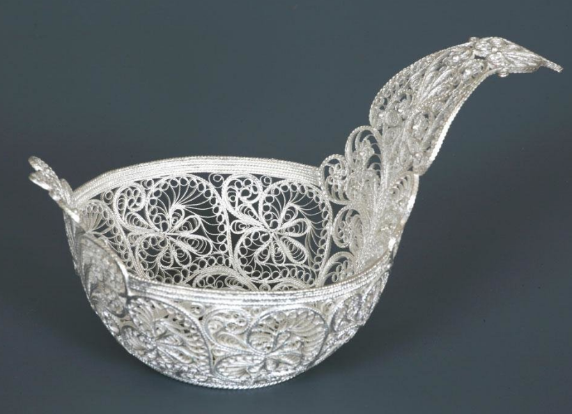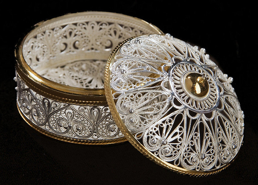 Объёмная филигрань — кубки, вазы, подносы, ларцы и строения, и даже существа — птицы, звери.