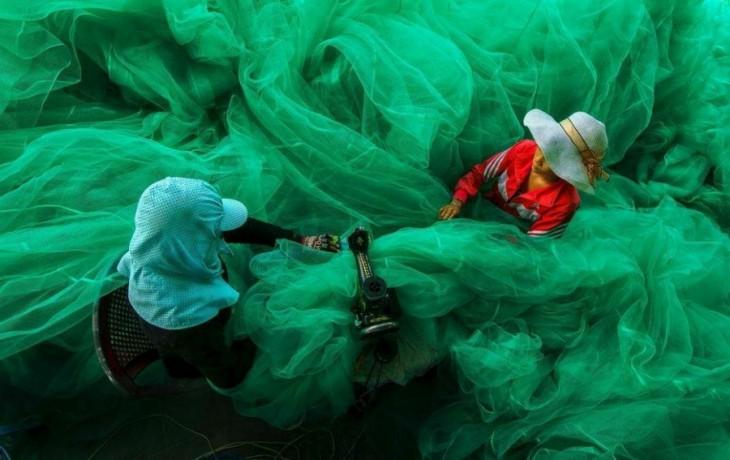 Это не ядовитый газ и не зловещий туман, две женщины шьют большую рыболовную сеть.