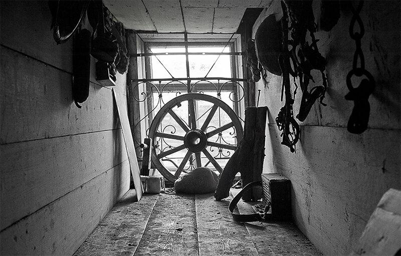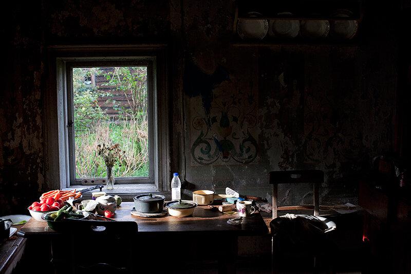 Через витражные окна экркеров можно наблюдать за безжалостным наступлением природы и времени на покинутую деревню. Изба Лукича, председателя Погореловского колхоза, крепкая еще несколько лет назад, рухнула этой зимой.