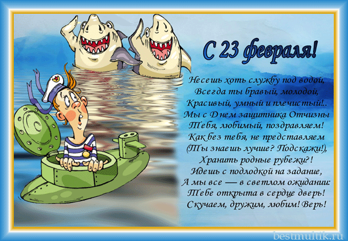 Для тех, кто хочет весело, с юмором поздравить своих мужей и возлюбленных, пап и дедушек, братьев и одноклассников, друзей и коллег с этим праздником, наша подборка несерьезных, веселых, прикольных открыток и поздравлений!