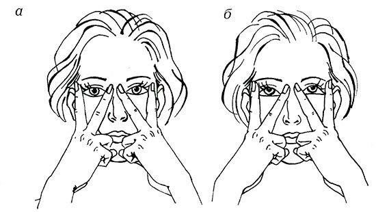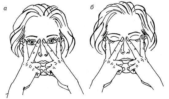 Положение «взгляд направлен вперед». Приложите подушечки средних пальцев к переносице у внутренних краев бровей, а кончики указательных — к внешним краям бровей и слегка надавите на кожу. Смотрите прямо перед собой и немного вверх. Напрягите нижние веки, как бы пытаясь сощуриться, а затем расслабьтесь. Верхние веки при этом двигаться не должны.
