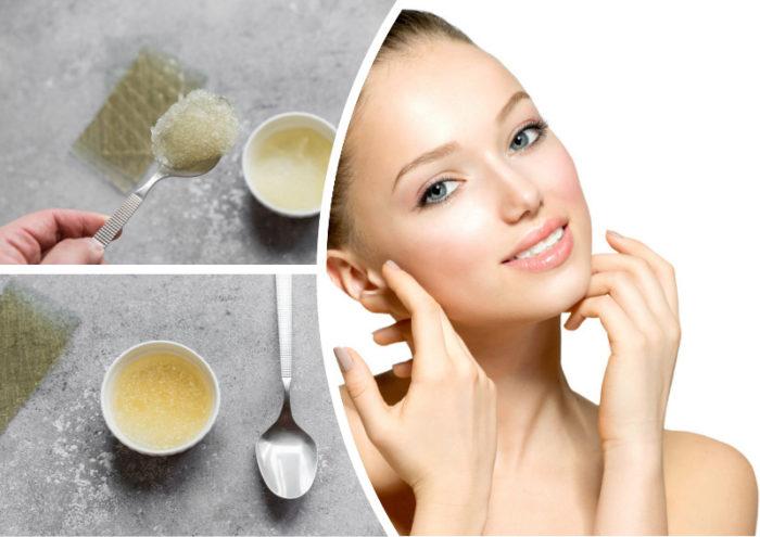 Известно ли вам, что именно желатин, благодаря своему стягивающему эффекту, салоны красоты используют в «механических» масках для подтягивания щек и второго подбородка? Желатин положительно влияет на белковый и аминокислотный обмен кожи, улучшая ее состояние, разглаживает мелкие морщинки, смягчает и отбеливает кожу, улучшает кровообращение.