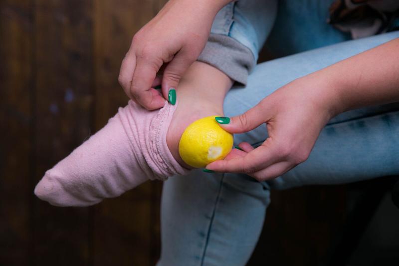 Разделите лимон пополам и выдавите из половинок сок. Приложите лимонные «чашечки» к пяткам. Наденьте носки и посидите так двадцать-тридцать минут.