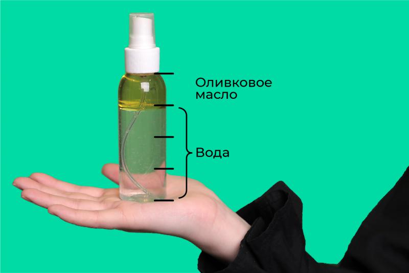 Смешайте воду и оливковое масло в пропорции 3:1. Перед нанесением этой жидкости хорошенько взболтайте баллончик.
