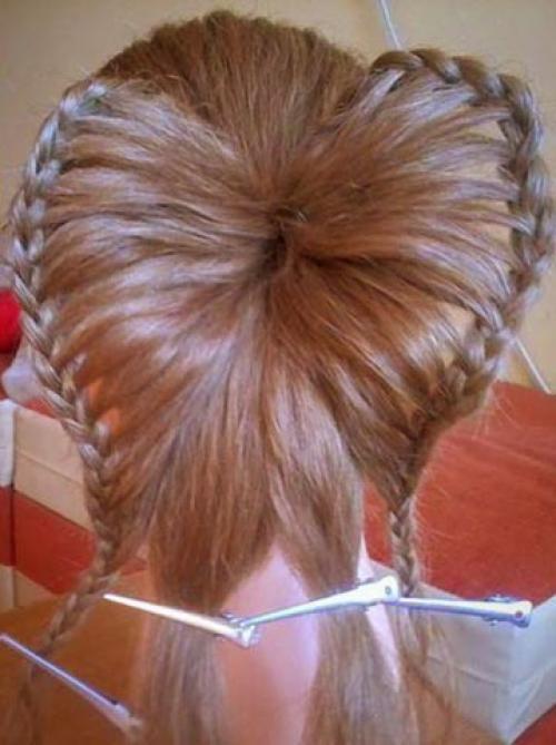 7. Из оставленных снизу волос создаем обычную косичку — это будет тело бабочки. Поднимаем косу вверх и крепим невидимкой.