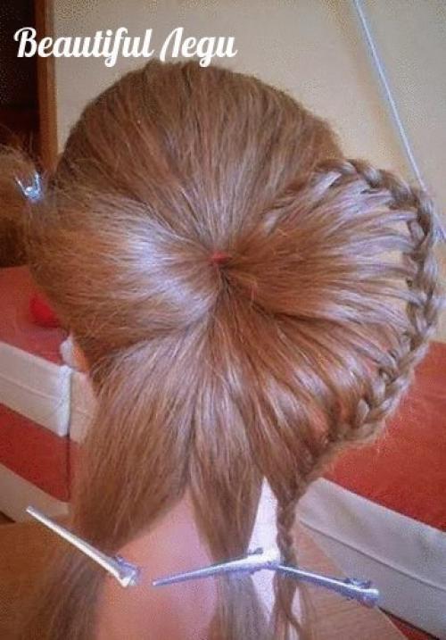 Для этого под волосами возьмите небольшую прядь, и добавьте к ней косичку. Все это закрепите тонкой резиночкой, сверху накройте волосами, чтобы не было видно.
