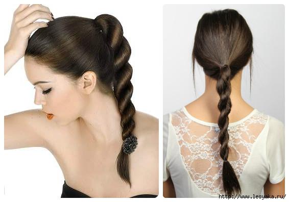 Эти косы на длинные волосы плести совсем не сложно, потребуется две резинки для волос и всего несколько минут на создание прически. Собираем на макушке высокий хвост, туго фиксируем резинкой. Разделяем волосы на две части и скручиваем в одну сторону. Затем формируем жгут, обматывая скрученные волосы по спирали. Внизу скрепляем второй резинкой.