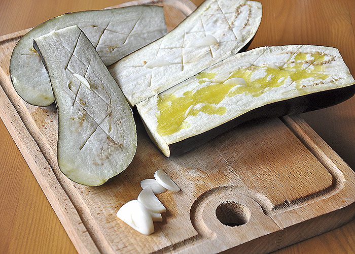 1. Готовим овощи, к запеканию. Разрезаю баклажан вдоль, делаю сеточку в мякоти. В разрезы, вставляю "листочки" чеснока, солю и заливаю оливковым маслом. Не сильно.