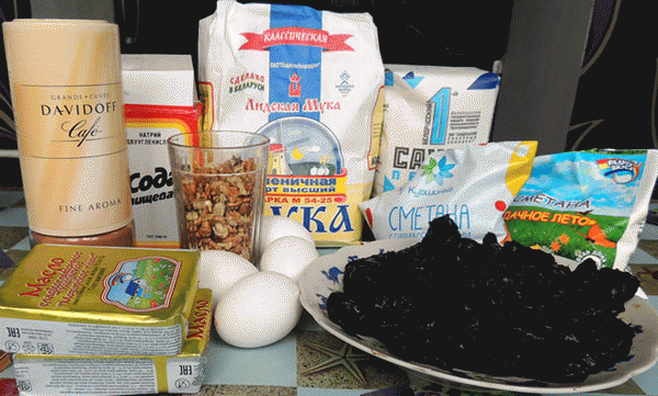 Орехи измельчить. Чернослив пропустить через мясорубку или блендер. Масло взбить с 0,5 стакана сахара. Отдельно взбить сметану с 0,5 сахара. Смешать два крема, добавить к ним чернослив и орехи.