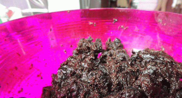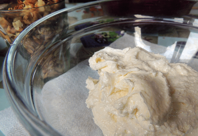 Делю в миске на три куска, один откладываю в другую посуду и добавляю туда какао, оно легко вмешивается.