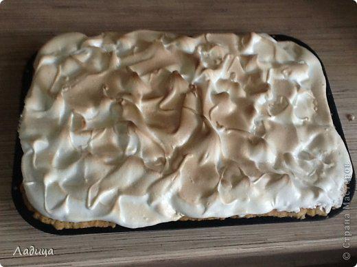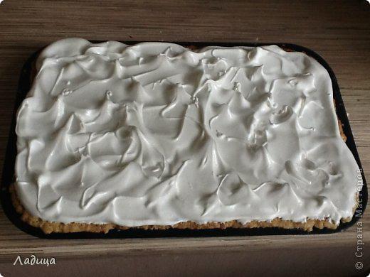 Тем временем белки взбиваем с сахаром. По прошествии назначенного времени, противень вынимаем из духовки, на почти готовый торт выкладываем безе и ставим обратно.