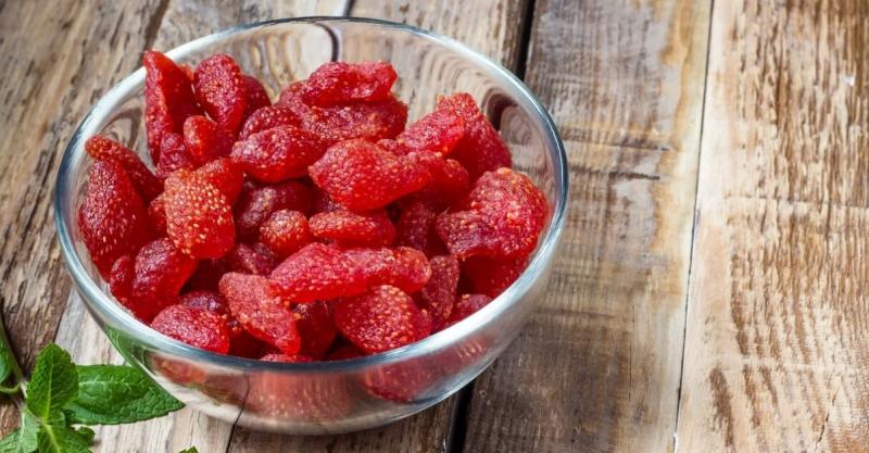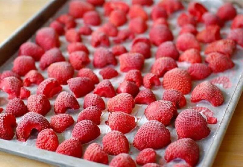 После этого разложить клубнику на противне и поставить в духовку с температурой 35-45 градусов и держать там до тех пор, когда поверхность ягод хорошо подсушится, но при этом плоды не потеряют эластичности.