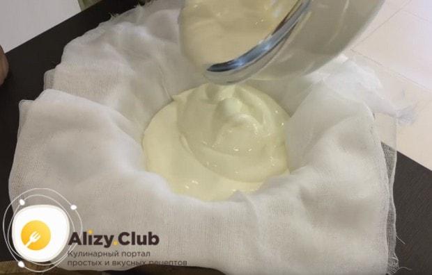На глубокую кастрюлю поставить мелкое сито, застелить его марлей, сложенной в 3-4 слоя, и выложить в нее сметанную массу.