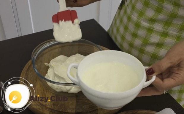 В удобной посуде смешать лопаткой 350 г жирной сметаны и 280 г классического йогурта без добавок.