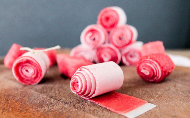 Достав пастилу и остудив, нарежьте её ножницами прямо с пергаментом на полоски и сверните их рулонами.