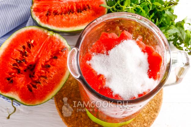 Нарезанную мякоть выложите в чашу блендера или измельчителя, всыпьте сахарный песок. По желанию его можно заменить цветочным медом или сиропом.
