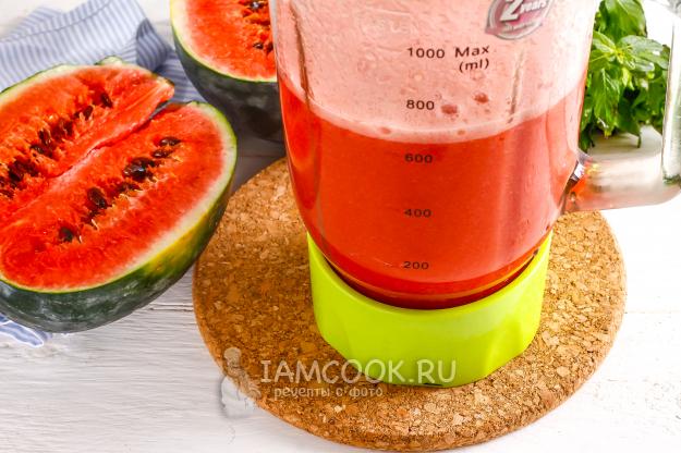 Разлейте арбузный смузи по бокалам и подавайте к столу.