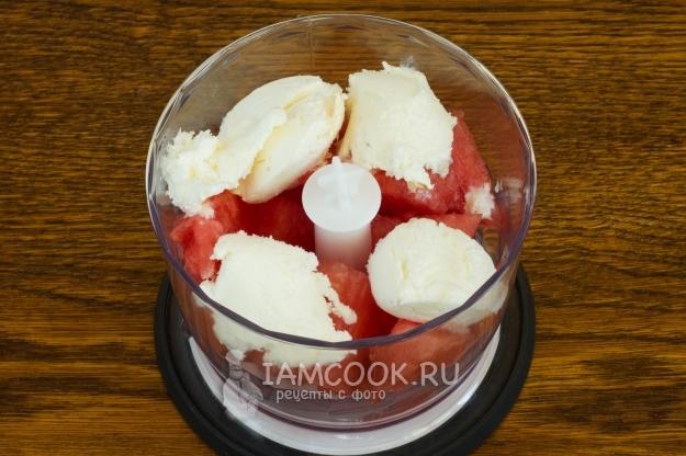 Положите в блендер 290 г мякоти. Десертной ложечкой выньте из стаканчика мороженое и добавьте в чашу блендера к арбузу.