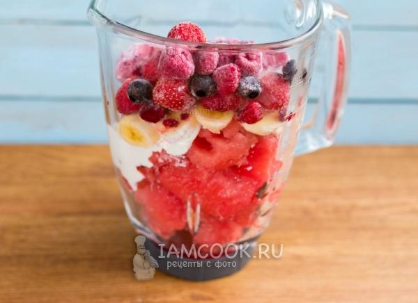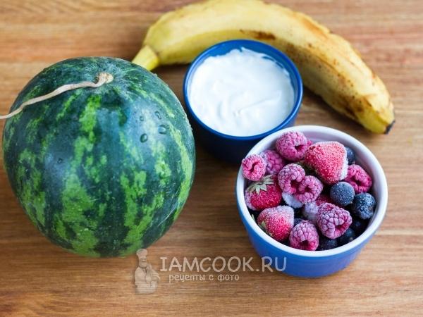Для приготовления нежного «йогуртового» смузи из арбуза дополним мякоть арбуза замороженными ягодами, бананом и йогуртом. Использование замороженных ягод позволяет готовить холодный и густой смузи, не добавляя лед и не разбавляя тем самым смузи водой. Для большего охлаждающего эффекта можно предварительно также заморозить нарезанный кусочками банан.