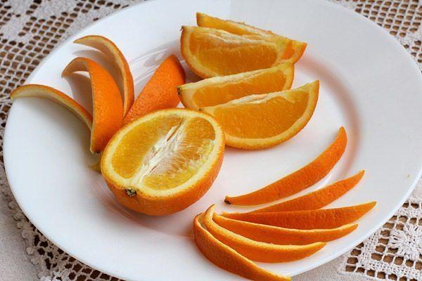 1. Апельсины тщательно моем и обдаем кипятком, чтобы смыть слой консервантов с поверхности. Апельсины разрезаем вдоль на 4 части, каждую из частей еще пополам. Получаются арбузные дольки. Мякоть удаляем, а затем разрезаем каждую дольку кожуры еще пополам, в итоге получаются довольно тонкие полоски.