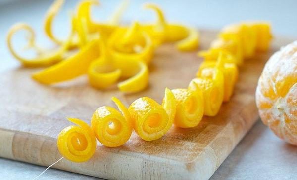 2. Полосоки кожуры помещаем в глубокую миску и заливаем полностью водой. Вымачиваем 3-4 дня, регулярно меняя воду. Затем с каждой полосочки ножом удаляем альбедо (белую часть с внутренней стороны кожуры). Сворачиваем каждую полоску в спиральку и нанизываем на нитку как бусы.
