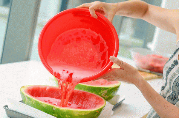 1. Арбуз тщательно вымыть под водой, обсушить и разрезать пополам. Из обеих половинок арбуза с помощью ложки и ножа достать всю мякоть.