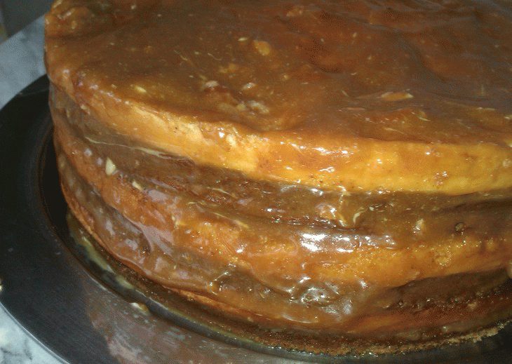 Итак, каждый слой мы пропитываем кофе или разведенным вареньем, покрываем кремом, посыпаем орехами. На самый последний слой орехи не посыпайте.