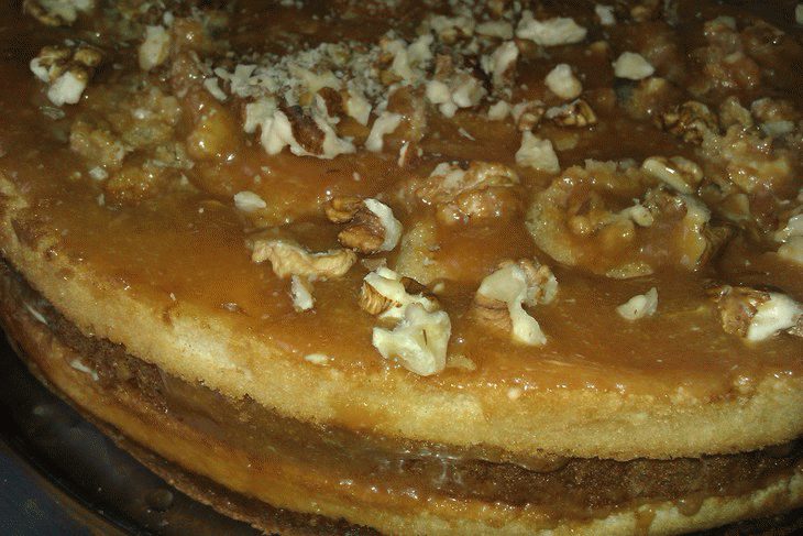Смазать каждый слой кремом, посыпать грецкими орехами.