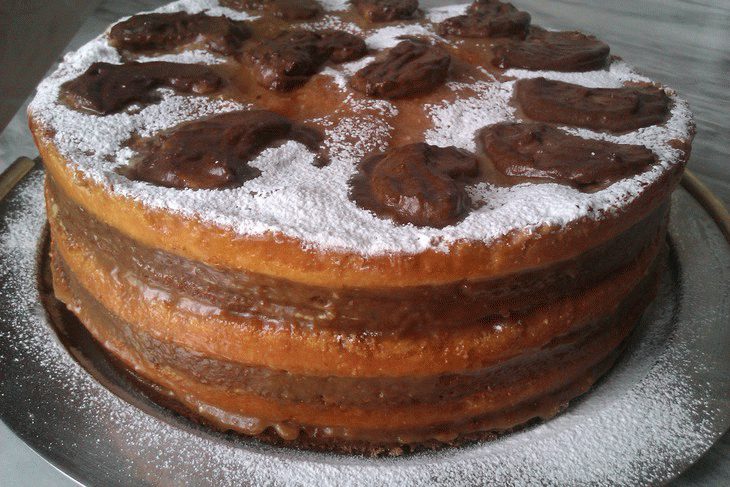 Берете готовые коржи, их обязательно нужно пропитать теплым сладким кофе или развести в теплой воде любое варенье. Лучше чередовать темные и светлые коржи.