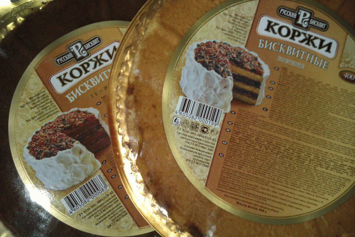 - 2 упаковки коржей. Я беру упаковку светлых коржей и упаковку темных;