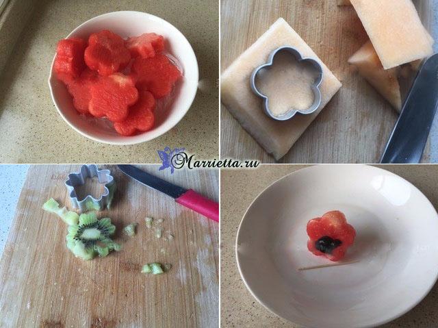 Нам понадобится арбуз, дыня, виноград, сливы, киви, а также - шашлычные палочки и зубочистки.
