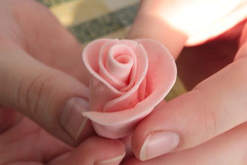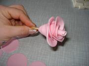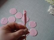 Из кружочков формируем бутон розочки на шпажке. Шпажка это стебелёк, кружочки — это лепестки.