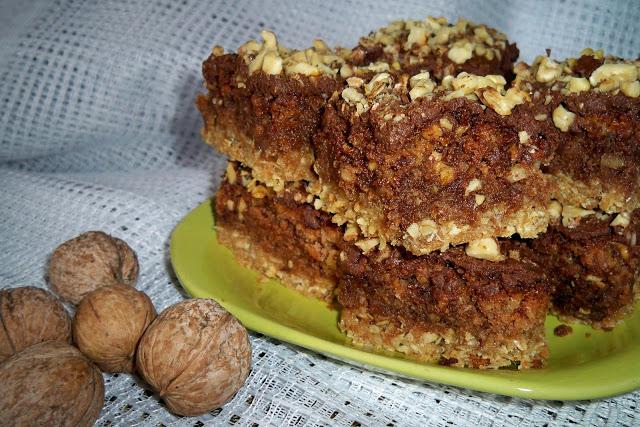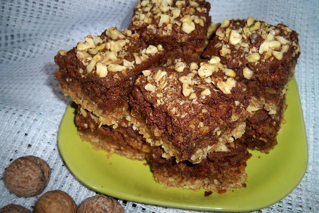 8. Вынуть из духовки пирожные, смазать шоколадным третьим слоем. Посыпать орехами и шоколадом. Дать пропитаться неск. часов в холодильнике.