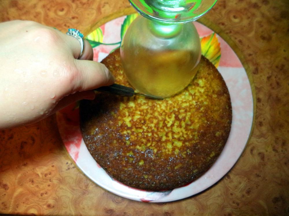 Готовый бисквит остудить до комнатной температуры. Вынуть из формы и переложить на просторную плоскую поверхность (большую тарелку диаметром см на 10 шире бисквита или поднос, разделочную доску).