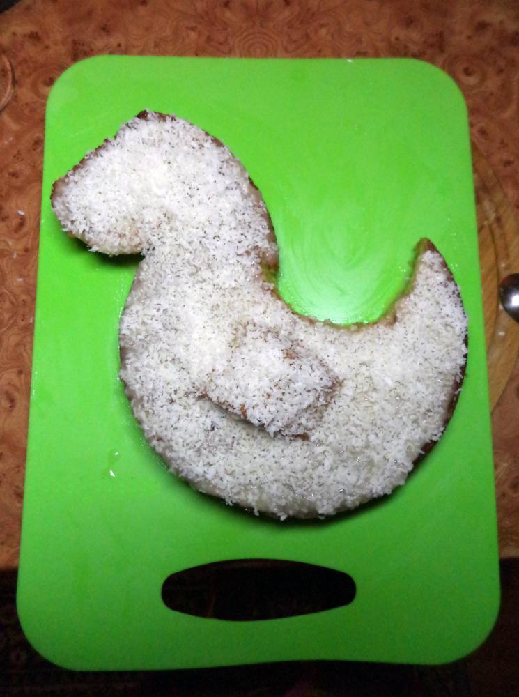 Бисквит круглой формы надо разрезать на 3 детали. А потом составить их между собой, склеить с помощью крема, потом смазать петуха кремом сверху. И обсыпать кокосовой стружкой. У кого ее нет, можно просто оставить крем (если он белый) или посыпать мелко нарезанным белым зефиром.