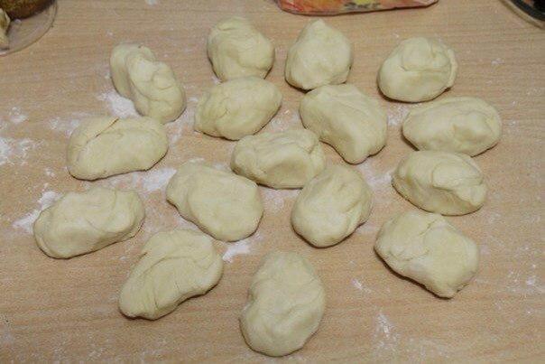 Вишни замороженной было мало, поэтому недостающее количество я взяла из вишневого варенья. Ягоды обязательно отжать от сока. Тесто разделить на 16 частей.