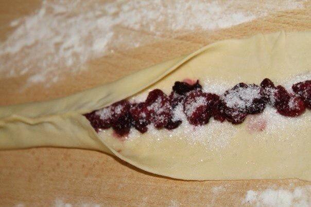 Каждый кусочек раскатать, положить по центру вишню, присыпать сахаром. Хорошенько защепить края.