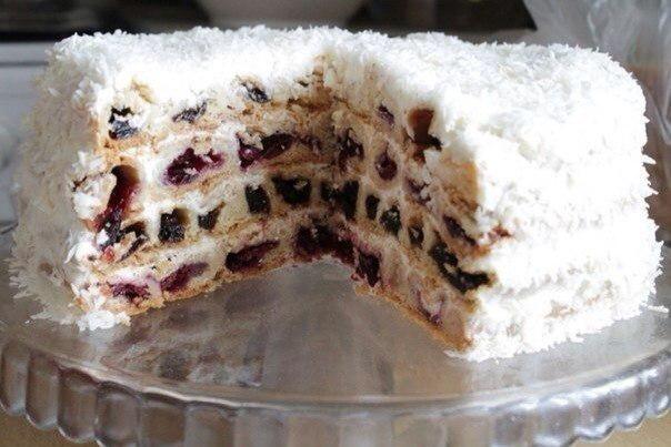 Торт «Вишня в снегу» понравится любителям песочно-ягодных коржей, пропитанных нежным сметанным кремом. Он чудесным образом украсит любой праздничный стол!