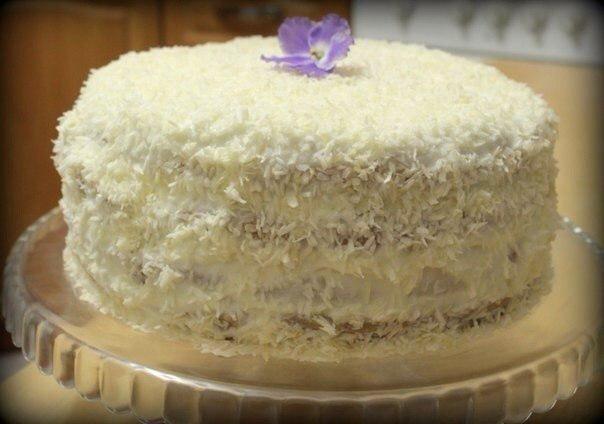 Украсить кокосовой стружкой. Коржи прекрасно пропитываются кремом, торт становится сочным и вкусным. В разрезе выглядит просто чудесно!
