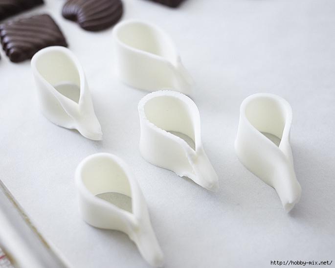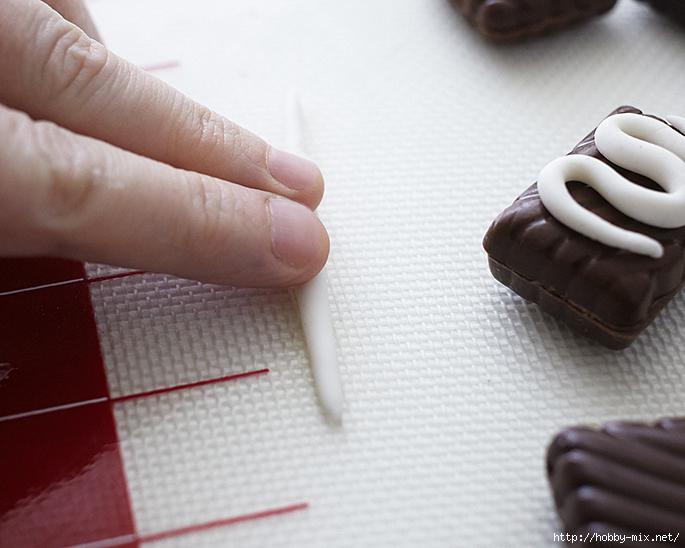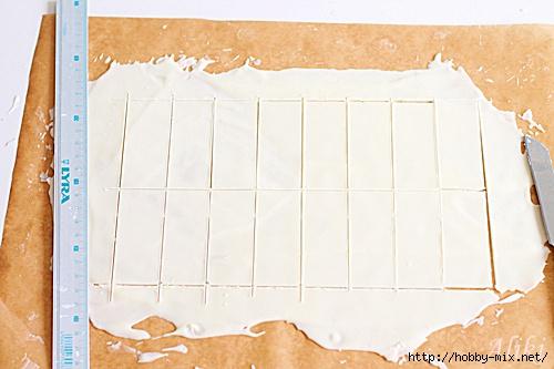 Растопить белый шоколад, вылить его на вощеную бумагу, пока теплый, разрезать на одинаковые прямоугольники